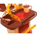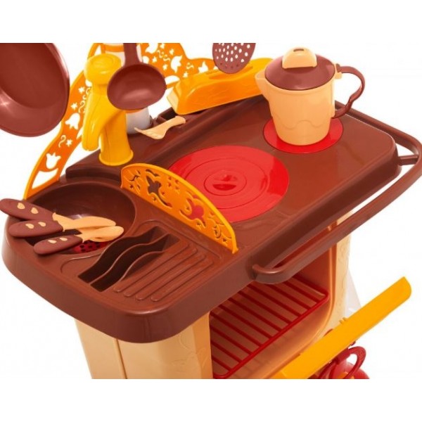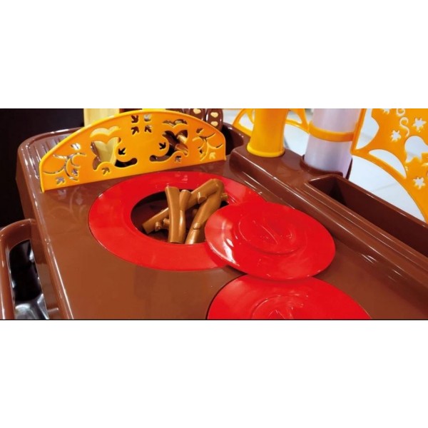 Estilosa e funcional a cozinha do sítio estimula a criatividade das crianças através do faz de conta. A graça da cozinha fica por conta do fogão superior com peças de encaixe, como em um fogão a lenha de verdade! E, para enriquecer ainda mais a brincadeira, o fogão possui um suporte para pendurar o pano de louça na borda, e a coifa é multiuso, nela é possível pendurar os utensílios da cozinha. Além das cores atemporais que lembram uma cozinha de sítio, ela acompanha vários acessórios, como pratos, xícaras, talheres, panela e leiteira com tampa. Também possui pia com torneira que sai água de verdade, conta ainda com mais um forno na parte inferior, com gaveta.