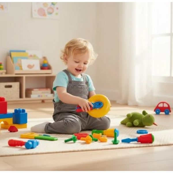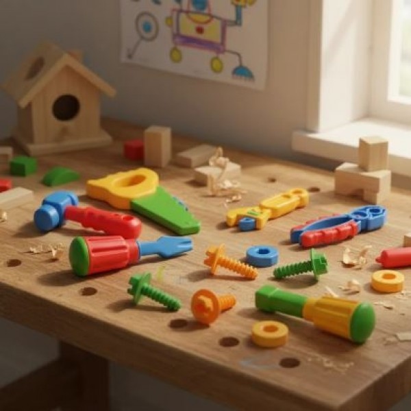 O kit vem com alicate, chave de fenda, chave de boca, chave inglesa, serrote que faz barulho igual ao de verdade, martelo, parafusos e porcas.