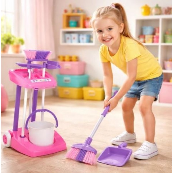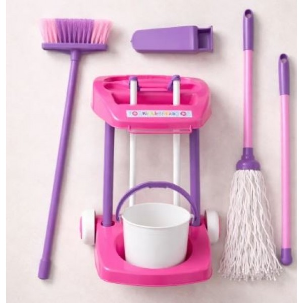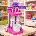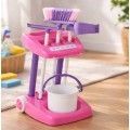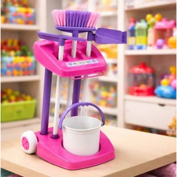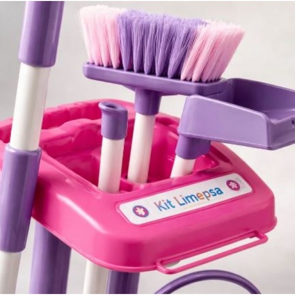 Para brincar de casinha igual a mamãe! O kit vem com vassoura, rodinho, pá, baldinho e um carrinho que encaixa todos os itens e dá pra levar a brincadeira onde quiser!
