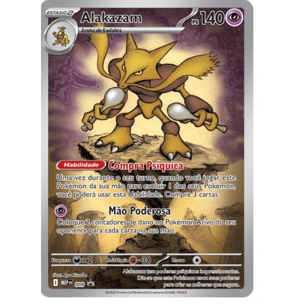 - 1 carta laminada promocional com arte expandida de Alakazam ou Riolu, a depender de sua escolha de variação ;